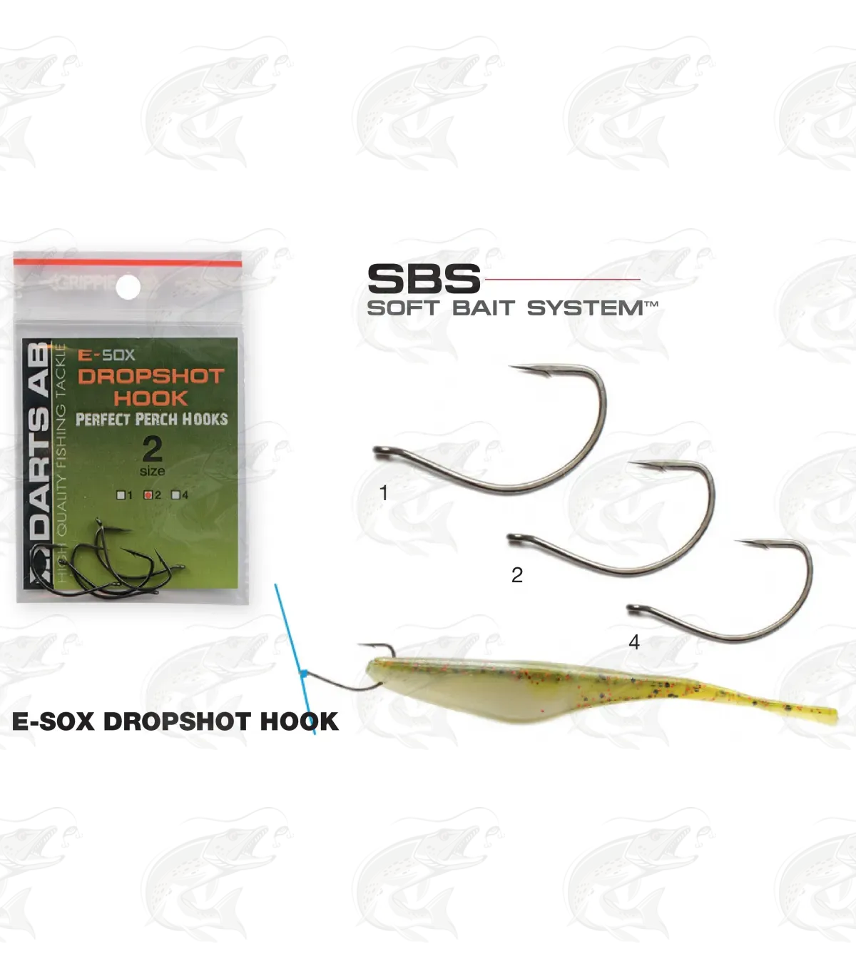 Darts E-Sox Drop Shot hook has a wide gap and incredible sharpness. The slightly curved hook eye ensures that the tip point has an optimal angle to the line, which gives great hooking results.