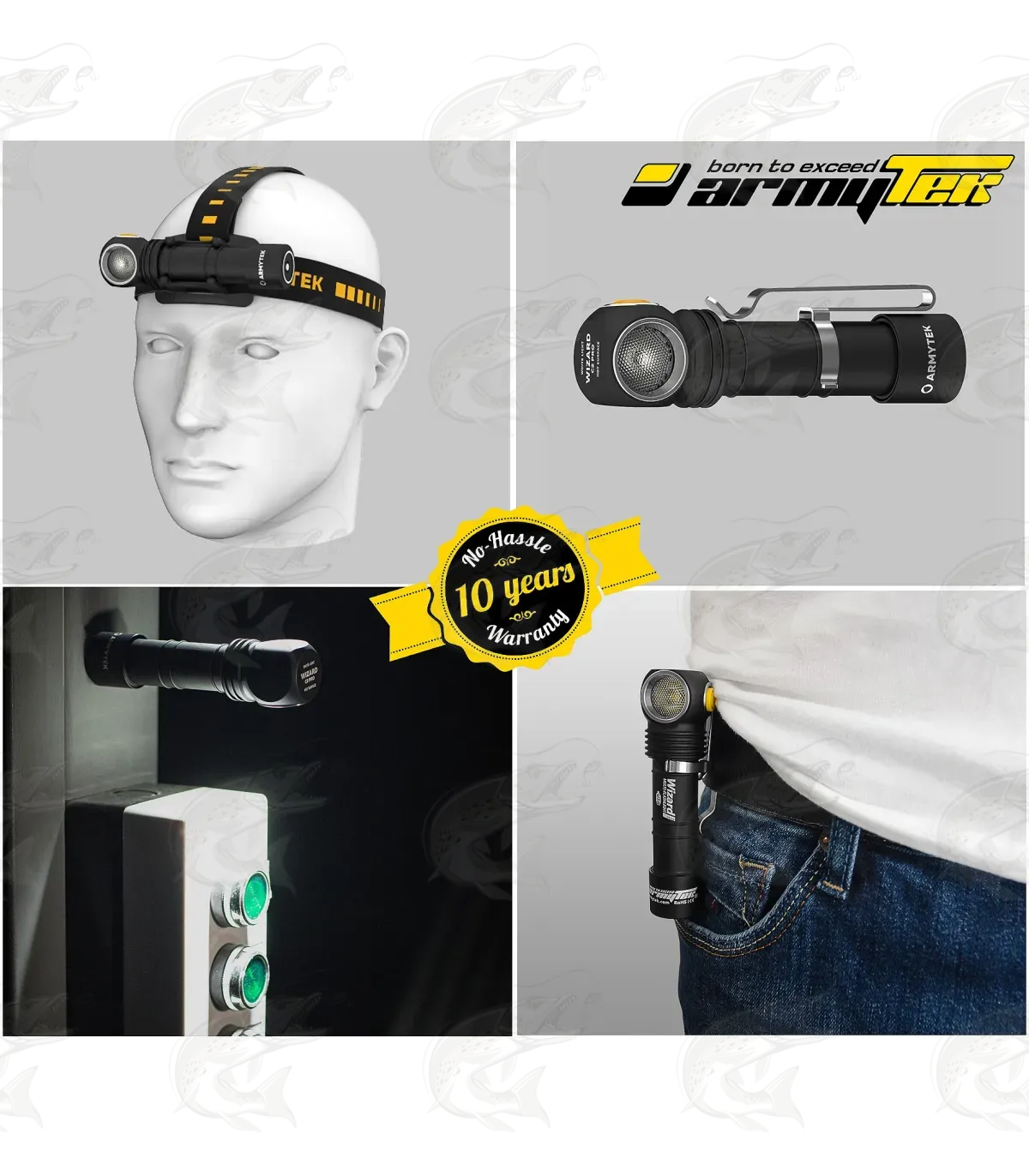Armytek repairs or replaces, in their option, without charge, any products or parts which are found to be defective under normal use and service within 10 YEARS (for flashlights excluding batteries, switches and connectors which have 2 YEARS warranty, also mounts and chargers with 5 YEARS warranty), 2 YEARS (for other accessories) from the date of purchase with proof of purchase.
