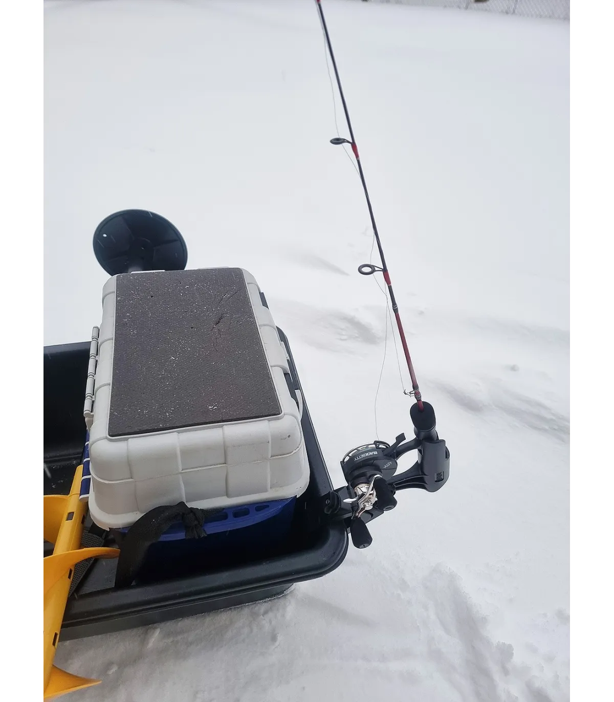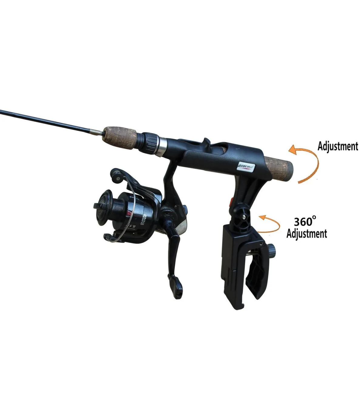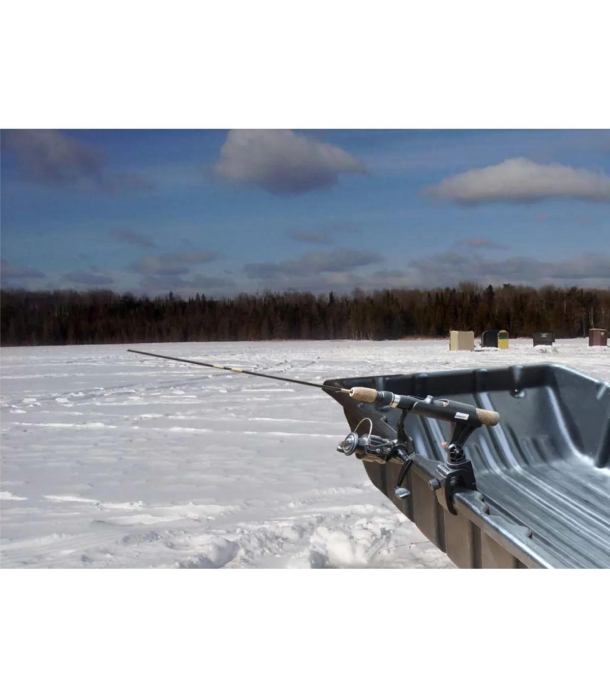 Holder for attaching the ice rod to a sled or a bucket. Adjustable angles.