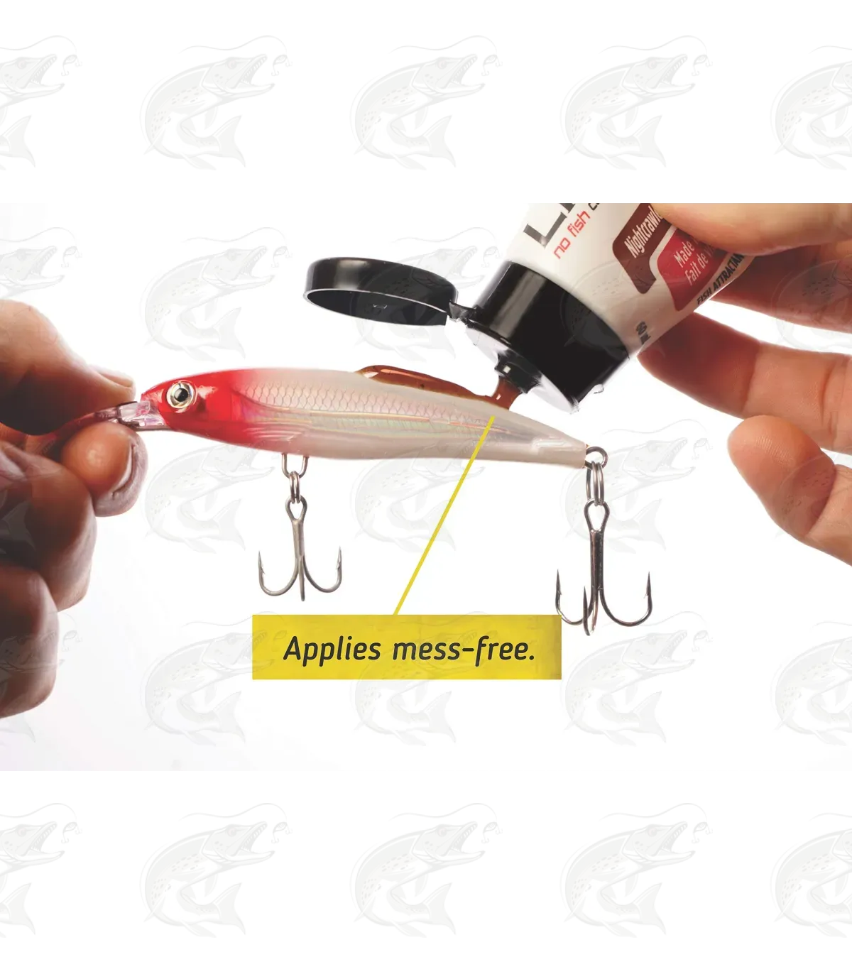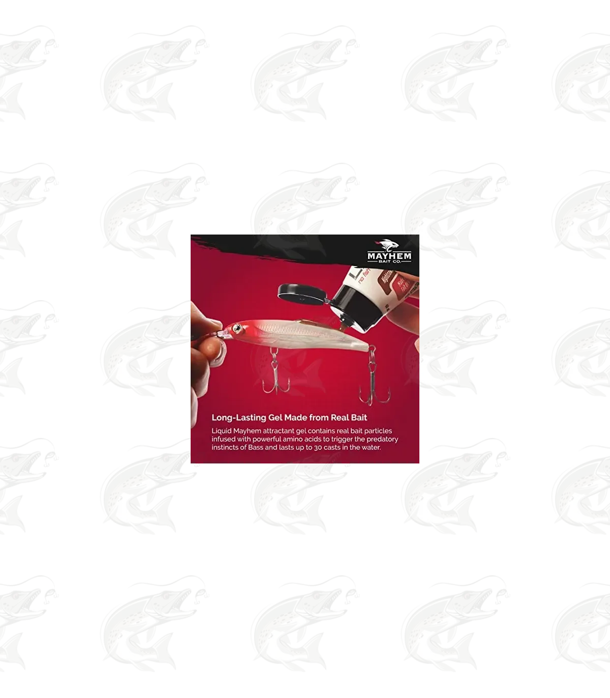 To use the Liquid Mayhem Fish Attractant, simply spread it across the surface of the bait and repeat every 30-or-so casts.